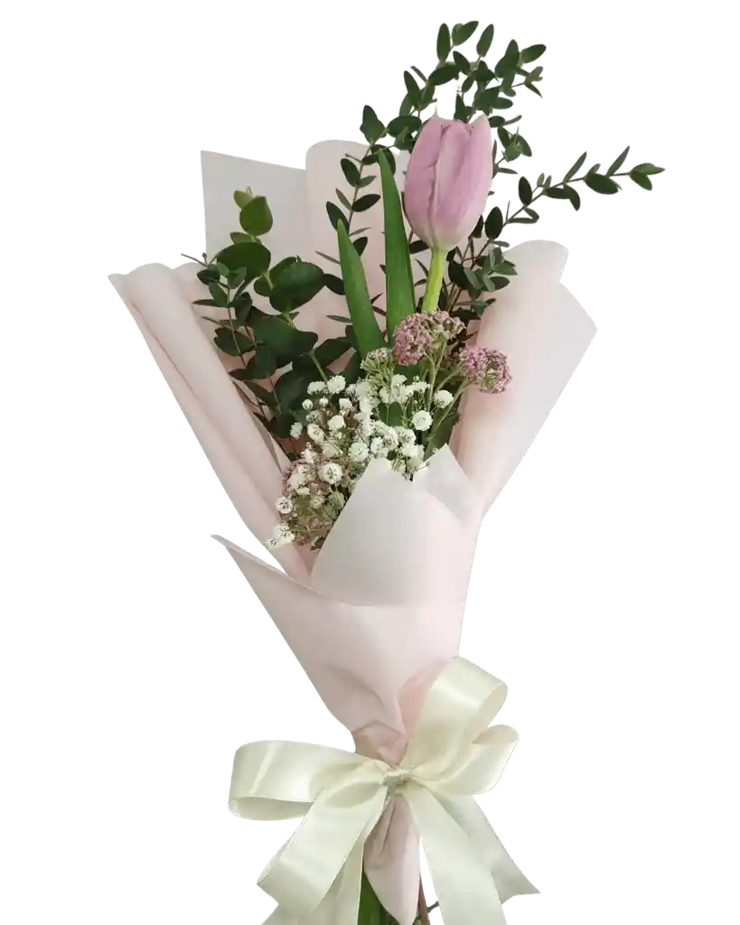 Ramito con 1 Tulipan. El tulipan se envia en un color aletorio, por lo que la imagen es una referencia. Los follajes de acento y el tono del papel coreano puede variar según disponibilidad.