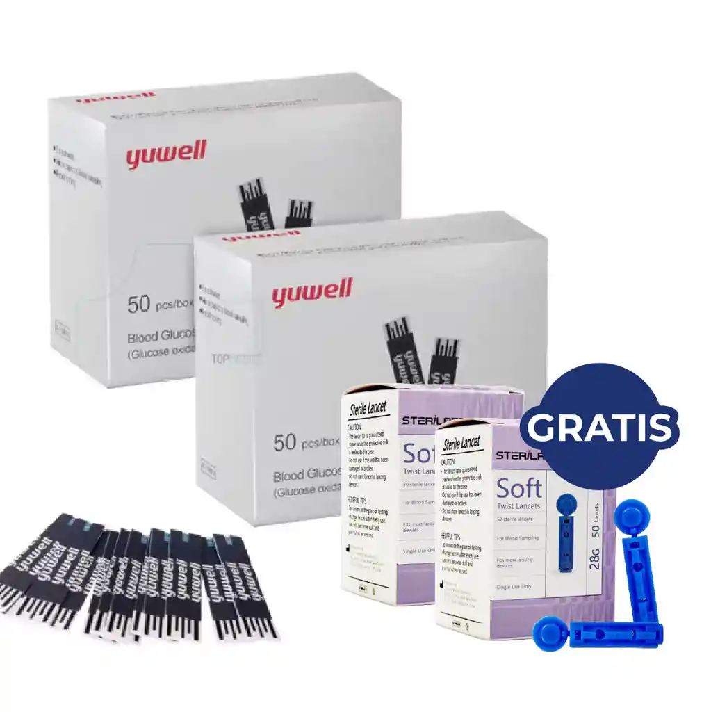 100 Tiras Reactivas Y330 + GRATIS 100 Lancetas Soft Sense 28G YUWELL El combo de 100 Tiras Reactivas Y330 + 100 Lancetas Soft Sense 28G es un kit esencial para realizar mediciones confiables de glucosa en sangre de forma rápida, higiénica y cómoda. Las tiras reactivas Y330 están diseñadas para ofrecer resultados precisos cuando se utilizan con los medidores compatibles, mientras que las lancetas Soft Sense 28G permiten una punción suave, minimizando el dolor y facilitando el uso diario, incluso en personas con piel sensible. CARACTERÍSTICAS PRINCIPALES *Tiras Reactivas Y330* -Diseñadas para mediciones precisas de glucosa en sangre. -Requieren una pequeña muestra de sangre. -Fácil absorción para resultados confiables. -Uso sencillo e higiénico. -Presentación sellada para conservar su calidad. *Lancetas Soft Sense 28G* -Calibre 28G para una punción suave y cómoda. -Punta fina que reduce la sensación de dolor. -Uso estéril y desechable. -Compatibles con la mayoría de dispositivos de punción estándar. -Ideales para uso frecuente y diario. BENEFICIOS -Control efectivo de la glucosa: mediciones confiables en cada uso. -Mayor comodidad: punción más suave gracias al calibre 28G. -Uso práctico: ideal para el monitoreo diario en casa o fuera de ella. -Kit completo: todo lo necesario para realizar la medición. -Higiene y seguridad: productos estériles y de un solo uso. MODO DE USO 1. Lava y seca bien tus manos antes de iniciar la medición. 2.Inserta una tira reactiva Y330 en el medidor compatible. 3.Coloca una lanceta Soft Sense 28G en el dispositivo de punción. 4.Realiza la punción en el lateral del dedo. 5.Aplica la gota de sangre sobre la tira reactiva. 6.Espera el tiempo indicado por el medidor para obtener el resultado. 7.Desecha la lanceta y la tira usada de manera segura. ¿PARA QUIÉN ESTÁ INDICADO? -Personas con diabetes tipo 1 o tipo 2. -Usuarios que requieren mediciones frecuentes de glucosa. -Personas que buscan un monitoreo confiable y cómodo. -Adultos mayores o cuidadores que realizan controles en casa. REGISTRO INVIMA -LANCETAS REGISTRO INVIMA 2025DM-0031248 -TIRAS REACTIVAS REGISTRO INVIMA 2023RD-0007957 PREGUNTAS FRECUENTES ¿Las tiras Y330 son compatibles con cualquier glucómetro? No. Las tiras reactivas Y330 deben utilizarse únicamente con los medidores compatibles indicados por el fabricante. Verifica siempre la compatibilidad antes de comprar. ¿Las lancetas Soft Sense 28G son reutilizables? No. Las lancetas son de un solo uso para garantizar higiene, seguridad y una punción efectiva. ¿El calibre 28G duele? El calibre 28G está diseñado para ofrecer una punción suave y cómoda, reduciendo al máximo la molestia durante la medición. ¿Puedo usar este kit para mediciones diarias? Sí. Este combo está pensado para el uso diario y frecuente, ofreciendo comodidad y resultados confiables.