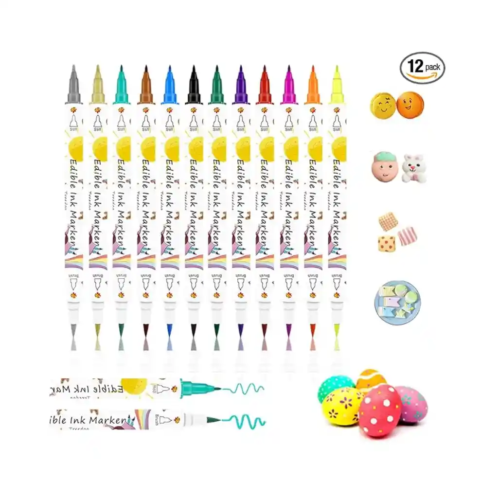 12 rotuladores para colorear alimentos vívidos: oro, plata, negro, rojo brillante, morado, amarillo fluorescente, naranja fluorescente, verde hierba, azul cielo, rojo rosa, verde menta, marrón. Cada juego de bolígrafos comestibles contiene 12 vibrantes bolígrafos para colorear alimentos, lo que hace que hornear sea divertido y personalizado. Nuestros marcadores comestibles contienen colores cuidadosamente formulados, materiales seguros y confiables, y no cambiarán la textura o el sabor de los postres favoritos de los niños. 12 tipos de colores ricos hacen que el trabajo de los niños sea más destacado 10% seguro y comestible: los marcadores comestibles de grado alimenticio Treedoa están hechos con tinta comestible de grado alimenticio, no tóxico, inodoro y no alteran el sabor. Todos contienen colorante alimentario y han pasado pruebas de seguridad. Todos los ingredientes son comestibles, por lo que es seguro y confiable para nosotros. Por favor, siéntase libre de usarlos Múltiples usos: los bolígrafos para colorear Treedoa Food son adecuados para superficies lisas y secas, como huevos de Pascua, galletas, fondant, galletas, pasteles, dulce de azúcar, pasteles, chocolate blanco, glaseado, donas, malvaviscos, frutas, verduras, etc. Es muy adecuado para cumpleaños, Halloween, Navidad, Día del Niño, Pascua, aula y actividades familiares de padres e hijos y fiestas para estimular la creatividad ilimitada de los niños Bolígrafos exclusivos para colorear alimentos dorados y plateados: el juego de bolígrafos Treedoa para colorear alimentos recientemente actualizado contiene los exclusivos bolígrafos comestibles de oro y plata del mercado, aportando más colores, más posibilidades y diversión a tus creaciones. Juego asequible, colores a juego, añádelo al carrito ahora. Disfruta del maravilloso tiempo de imaginación y bricolaje con tu familia Punta flexible de doble cara recién actualizada: la punta de doble cara proporciona una mayor flexibilidad para su diseño de dibujo y pintura. La punta fina mejorada es de solo 0.020 in de tamaño, que se puede utilizar para escribir letras, contornos, figuras art deco y añadir detalles más complejos. La punta ancha y lisa del otro lado es conveniente para colorear sombreado, mezclar y dibujar Disfruta de la comida por bricolaje: los marcadores comestibles Treedoa son perfectos para estarcido, estampado o diseño de patrones a mano alzada en la superficie de los alimentos (excepto la superficie de cera). Perfecto para jóvenes y mayores, niños, mujeres y hombres. Créanos, a todos os encantarán estos marcadores de alimentos Apto para niños: los bolígrafos para colorear alimentos Treedoa son muy adecuados para que los principiantes diseñen y pinten alimentos creativos a diario. Los niños son fáciles de usar y entretenidos. Pueden decorar y garabatear alimentos a voluntad para ejercitar su creatividad y capacidad práctica. Este es el mejor regalo para el Día del Niño, Halloween, Año Nuevo y cumpleaños, y a tus hijos definitivamente les gustará mucho