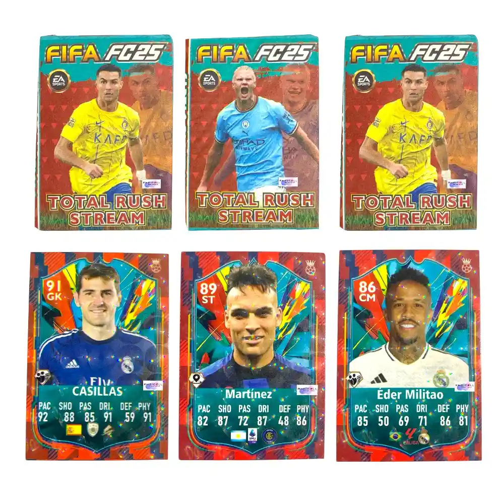 Cartas de Fútbol Coleccionables Incluye: 50 sobres de cartas, 3 cartas x sobre (150 cartas en total) Modelo: FIFA FC25 Total Rush Stream ¡Sumérgete en el mundo del fútbol como nunca antes con nuestras cartas FC25, diseñadas para los verdaderos fanáticos! Estas cartas no solo son una experiencia de colección, sino también el regalo perfecto para cualquier apasionado del fútbol. Prepárate para una experiencia que te llevará directamente al corazón del juego. ¡Colecciona, juega y vive la emoción del fútbol como nunca antes! Nota: Marca Genérica. No son colección Panini.