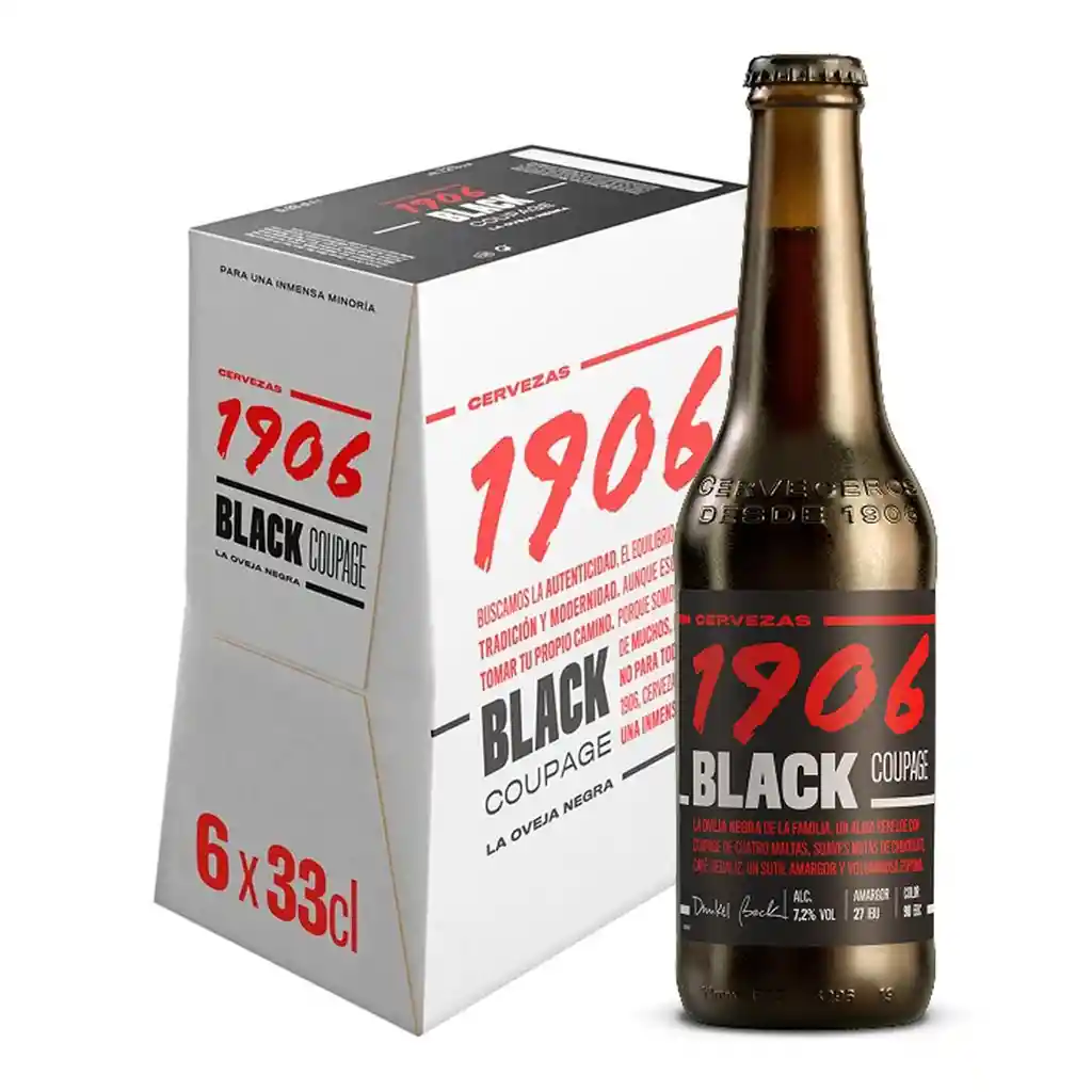 1906 Black Coupage La Oveja Negra es una cerveza española premium de carácter profundo y sofisticado, creada para paladares que buscan intensidad y diferenciación. Su coupage de maltas aporta notas tostadas y un equilibrio elegante con 7,2% Vol, brindando una sensación cálida y persistente ideal para disfrutar con calma. Perfecta para acompañar platos robustos o momentos especiales, invita al disfrute responsable, la conversación y la experiencia gastronómica. El Six Pack x6 (330 ml c/u) reúne tradición cervecera, calidad superior y un perfil distintivo que eleva cada ocasión.