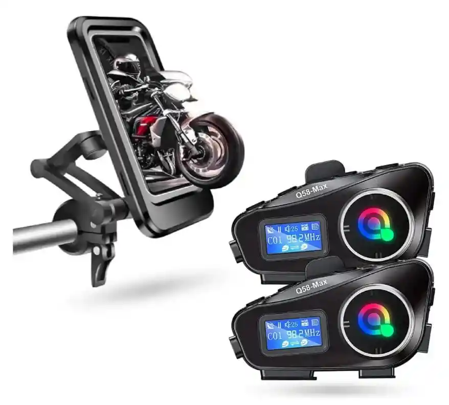 ¿Cansado de detener la marcha para revisar el GPS o perder la conexión con tu acompañante? Lleva tu experiencia de conducción al siguiente nivel con Elite Road. Este paquete no solo incluye tecnología de comunicación de vanguardia, sino también el blindaje perfecto para tu smartphone. INTERCOMUNICADORES Q58-MAX: MÁS QUE VOZ No son simples auriculares. El Q58-Max es una estación de control en tu casco: Alcance Real: Mantén una charla fluida hasta a 500 metros de distancia. Pantalla Inteligente: Visualiza frecuencia FM, batería y estado de conexión sin adivinanzas. Visibilidad de Noche: Equipados con una linterna LED integrada y un anillo de luces RGB dinámico que no solo se ve increíble, sino que te hace más visible. Multimedia Independiente: Ranura para Micro SD. Escucha tu propia música sin depender de la batería del celular. SOPORTE 360° MASTER: TU CELULAR SIEMPRE A SALVO Olvida las vibraciones y el miedo a la lluvia. Blindaje Total: Diseño completamente cerrado que protege contra agua, polvo y barro. Operación Táctica: Pantalla táctil de alta sensibilidad para que uses el GPS con un solo dedo, sin sacar el móvil del soporte. Ajuste Milimétrico: Base con rotación de 360° y brazo articulado para el ángulo perfecto de visión.