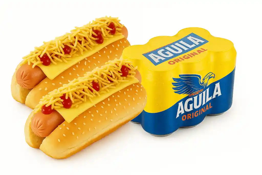 Promoción 2 Perros Calientes con Queso + Six Pack de Cerveza Aguila