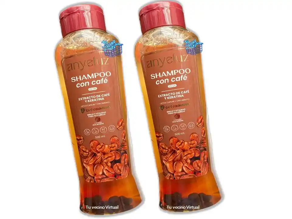 En tu vecino virtual también encontraras : Anyeluz, syam cosmetic, piel de oro, Kaba, class gold, lampiña, Te verde de matcha Benefit, te plus, te latte, te negro, exfoliante, aceite de coco, pomada alfa, colageno hidrolizado,vinipel osmótico, Bioaqua Acne, Mascarillas,tónico, Trendy, la pocion, HGW y muchos mas ————————————————————————————————————————————————— Shampoo Con Café Anyeluz Nuestro Shampoo de Café tiene una poderosa fórmula enriquecida con extractos naturales de café y keratina para un cabello más fuerte, brillante y sin frizz. Su acción antioxidante y detox permite una limpieza profunda, eliminando exceso de grasa e impurezas, mientras fortalece los folículos y estimula un crecimiento más denso y saludable. Gracias a sus propiedades anticaída y revitalizantes, aporta suavidad y cuerpo, siendo la opción ideal para quienes buscan combatir la caída del cabello de manera natural y beneficiarse del uso de la cafeína por sus cabellos finos o débiles. Beneficios Potenciales Ayuda a proteger el cabello del daño causado por cambios radicales. Previene el envejecimiento capilar gracias a su acción detox. Nutre y revitaliza la fibra capilar, dejando el cabello más manejable. Refuerza la estructura capilar desde la raíz, reduciendo el quiebre. Su fórmula con cafeína despierta el cuero cabelludo y deja una fragancia deliciosa a café. Es una alternativa sin químicos agresivos para estimular el crecimiento capilar. Modo de uso: 1.Moja el cabello y aplica el shampoo de café sobre el cuero cabelludo. Masajea suavemente durante 2 a 3 minutos para que la cafeína penetre en los folículos. Luego enjuaga completamente. Se recomienda usarlo 2 a 3 veces por semana para potenciar sus efectos. Contenido: 500mL