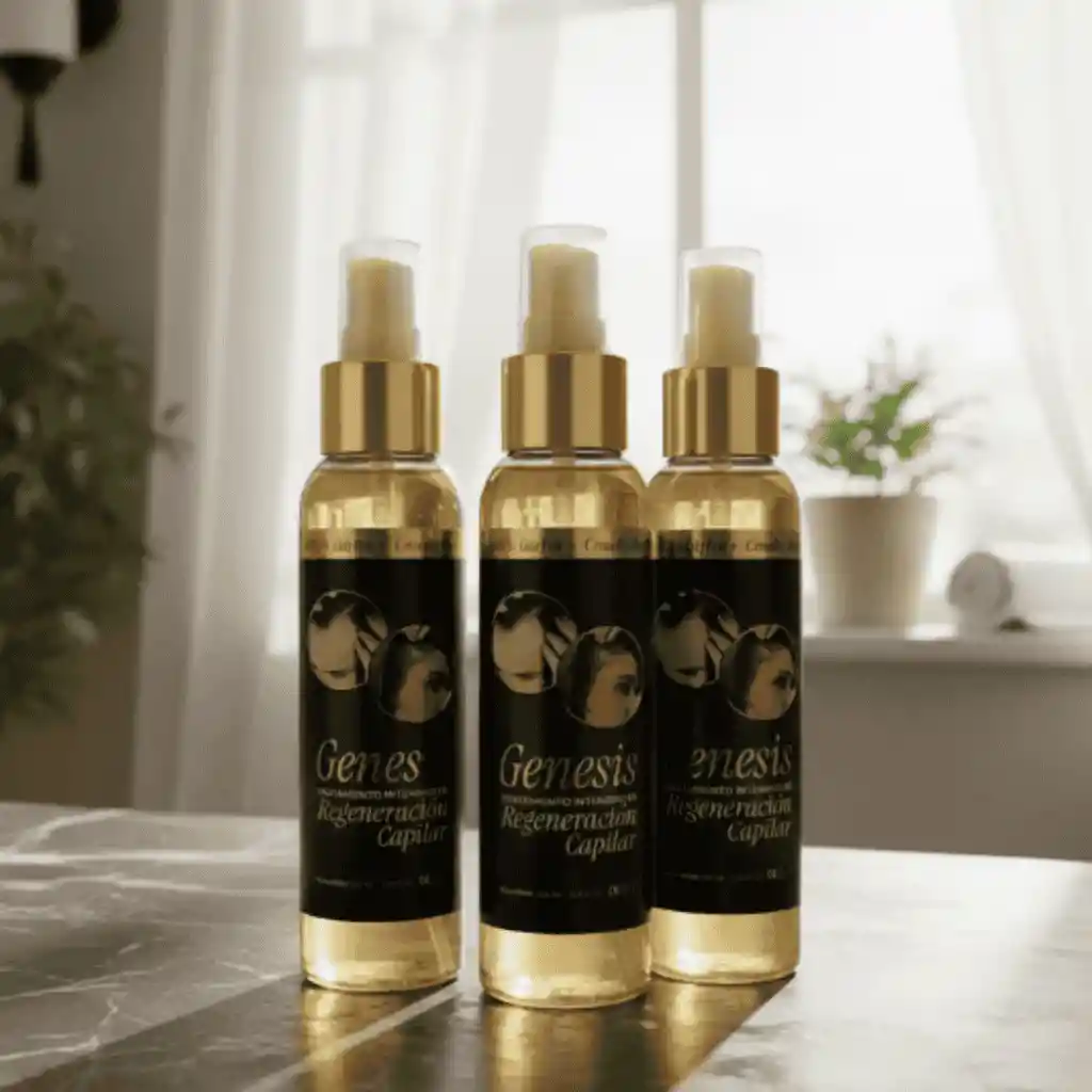 GENESIS® es un tratamiento capilar en formato de loción desarrollado para ayudar a mejorar la apariencia del cabello cuando se presentan signos visibles de caída, afinamiento o pérdida de densidad capilar. Su fórmula combina ingredientes botánicos y aminoácidos esenciales que trabajan en conjunto para fortalecer el cuero cabelludo y favorecer una apariencia capilar más saludable. La caída del cabello puede estar relacionada con múltiples factores, como estrés, cambios hormonales, procesos naturales de envejecimiento, factores genéticos, postparto o desequilibrios en el cuero cabelludo. Cuando esto ocurre, el cabello puede comenzar a verse más fino, con menor volumen o con zonas donde la densidad capilar parece disminuir. GENESIS® fue desarrollado para actuar directamente sobre el cuero cabelludo, ayudando a mejorar el entorno donde nace el cabello. Su objetivo es contribuir a fortalecer la raíz capilar y favorecer las condiciones necesarias para que el cabello luzca más fuerte, con mayor densidad y con mejor apariencia general. A diferencia de otros tratamientos capilares que trabajan únicamente sobre la fibra del cabello, GENESIS® se enfoca en el cuidado del cuero cabelludo, que es el lugar donde se origina el crecimiento capilar. Mantener un cuero cabelludo equilibrado es fundamental para que el cabello pueda desarrollarse de forma saludable. Su fórmula combina ingredientes de origen vegetal reconocidos en cosmética capilar por sus propiedades estimulantes y revitalizantes. Entre sus principales componentes se encuentran: Extracto de Romero: conocido por su uso tradicional en el cuidado capilar, ayuda a estimular el cuero cabelludo y mejorar la apariencia del cabello. Meliloto: ingrediente vegetal utilizado por sus propiedades que contribuyen a mejorar la circulación en el cuero cabelludo. Alfalfa: rica en nutrientes y compuestos naturales que ayudan a fortalecer la fibra capilar. Lúpulo: utilizado en cosmética capilar por su capacidad para aportar vitalidad al cabello. Aminoácidos esenciales: contribuyen a fortalecer la estructura capilar y mejorar la apariencia del cabello debilitado. Gracias a esta combinación de ingredientes, GENESIS® ayuda a mejorar la apariencia del cabello cuando presenta signos de debilitamiento, aportando nutrientes que favorecen un entorno capilar más equilibrado. ¿Para qué sirve GENESIS®? GENESIS® está diseñado para ayudar a: Mejorar la apariencia del cabello con signos de caída Favorecer una apariencia capilar más densa Fortalecer la raíz del cabello Mejorar el aspecto del cuero cabelludo Apoyar la apariencia de crecimiento capilar saludable Mejorar la apariencia del cabello fino o debilitado Beneficios de GENESIS® • Fortalece el cabello desde la raíz: ayuda a mejorar la apariencia del cabello debilitado. • Estimula el cuero cabelludo: favorece un entorno capilar más equilibrado. • Ayuda a mejorar la densidad capilar: contribuye a que el cabello luzca más abundante. • Aporta vitalidad al cabello: mejora la apariencia general del cabello. • Fórmula de uso diario: diseñada para integrarse fácilmente en la rutina capilar. ¿Para quién está recomendado? GENESIS® está recomendado para hombres y mujeres que presentan: Caída visible del cabello Afinamiento progresivo del cabello Cabello con menor densidad Caída relacionada con estrés o cambios hormonales Caída capilar postparto Cabello debilitado por el paso del tiempo También puede ser utilizado por personas que desean fortalecer su cabello y mejorar la apariencia de su densidad capilar. Modo de uso Aplicar GENESIS® directamente sobre el cuero cabelludo. Distribuir el producto en las zonas donde se desea mejorar la apariencia del cabello. Masajear suavemente con la yema de los dedos para facilitar la absorción. No enjuagar. Se recomienda utilizar el producto de forma diaria para obtener mejores resultados y permitir que los activos actúen progresivamente sobre el cuero cabelludo. Resultados esperados Con el uso constante, el cabello puede verse: Más fuerte Con mayor densidad aparente Con mejor apariencia general Con aspecto más saludable GENESIS® es una alternativa para quienes buscan un tratamiento capilar enfocado en mejorar la apariencia del cabello cuando se presentan signos de debilitamiento o caída, ayudando a fortalecer el cuero cabelludo y favoreciendo una apariencia capilar más abundante y saludable.