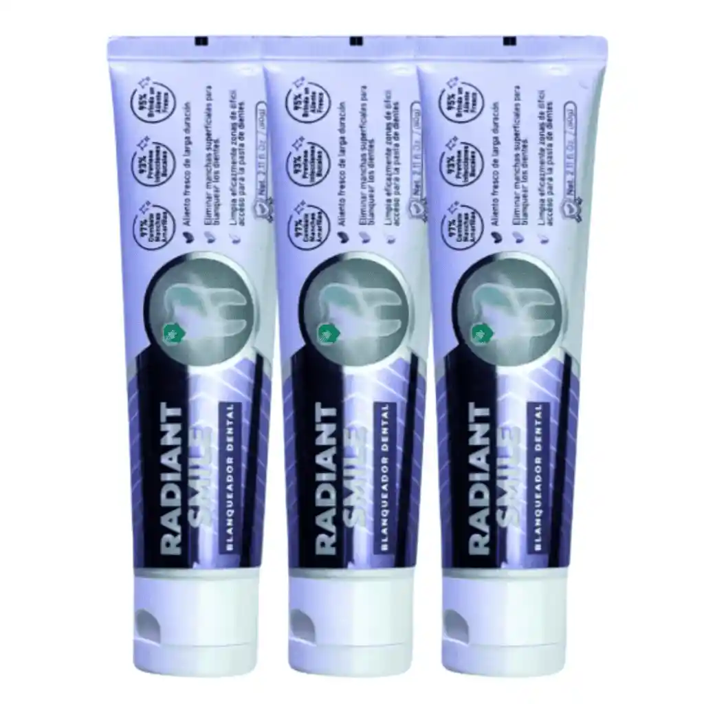 Radiant Smile es una crema dental blanqueadora formulada para eliminar manchas superficiales y neutralizar tonos amarillos, devolviendo el brillo natural a los dientes. Su sabor a menta ofrece una sensación de frescura prolongada, mientras protege el esmalte dental y combate bacterias que afectan la salud bucal. Beneficios de Radiant Smile: • Elimina manchas superficiales y blanquea los dientes. • Neutraliza tonos amarillos para una sonrisa más brillante. • Proporciona aliento fresco de larga duración. • Protege y fortalece el esmalte dental. • Combate bacterias que afectan la salud bucal. • Limpia eficazmente zonas de difícil acceso. • Libre de gluten, apta para toda la familia.