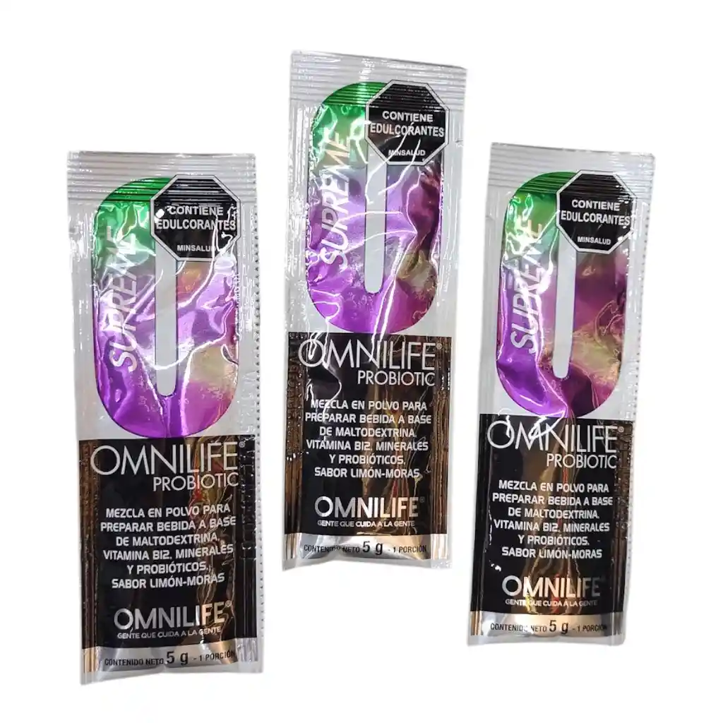 3 Sobres de PROBIOTIC SUPREME Omnilife Bebida en Polvo para Diluir. Mezcla en polvo sabor a limón moras, que contiene probióticos (Bacillus coagulans), extracto de té blanco, fibra, vitamina B12 y zinc. Con estevia, endulzante de origen natural. El suplemento Probiotic Supreme de Omnilife es un polvo nutricional con un delicioso sabor a limón-arándano (o limón-moras). Su fórmula contiene un billón de probióticos Bacillus coagulans que ayudan a regenerar y mantener el equilibrio de la flora intestinal, mejorando la digestión y fortaleciendo el sistema inmunológico. Además, incluye fibra prebiótica para nutrir a estos microorganismos beneficiosos, vitaminas, minerales como el zinc, y extracto de té blanco, todo endulzado con estevia y extracto de fruto del monje de origen natural.