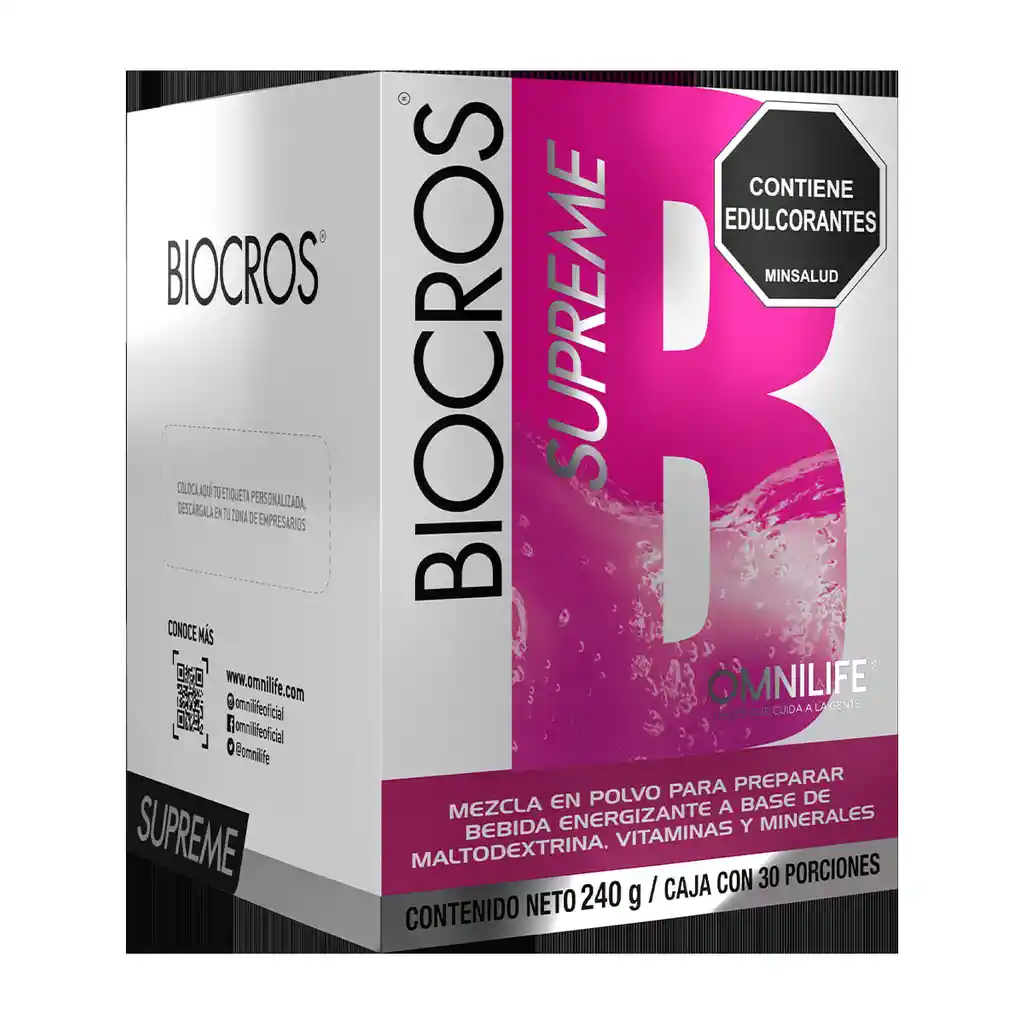 30 Sobres de BIOCROS SUPREME Omnilife Bebida en Polvo para Diluir Caja Completa. El suplemento Biocros Supreme de Omnilife (conocido en algunos países como Magnus) es un potente energizante natural con sabor a frutas cítricas diseñado para combatir el cansancio y la fatiga de forma inmediata. Su fórmula destaca por contener cafeína, taurina y glicina, junto con un alto contenido de vitaminas del complejo B y antioxidantes como las vitaminas C y E, que en conjunto proporcionan entre 6 y 8 horas de energía física y alerta mental constante. Al estar endulzado con estevia y fruto del monje, es una opción baja en calorías ideal para deportistas o personas con jornadas intensas que buscan mejorar su rendimiento sin los efectos negativos de las bebidas energéticas tradicionales.