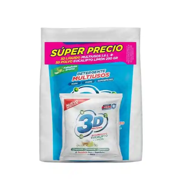 Pack 3D Contiene 2 Unidades. Detergente Líquido Multiusos 1.8 L 1 Und + Detergente Bicarbonato Eucalipto y Limón 250 g 1 Und.