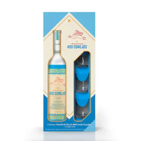Contiene 4 Unidades. 400 Conejos Mezcal Joven Espadín Artisan 750 mL + Glasses 3 Und. Mezcal 400 Conejos Joven Espadín 750 mL te Ofrece Una Experiencia 100% Artesanal. Elaborado Con Molienda de Piedra Tirada Por Caballo Fermentado en Tina de Madera y Destilado en Ollas de Cobre. Horneado en Leña Tipo Cónico Con un Volumen de Alcohol Del 38%. Su Sabor Suave y ah Umado Presenta un Balance Perfecto Entre Notas de Madera Agave Cocido Toques Herbáceos y Dulces..