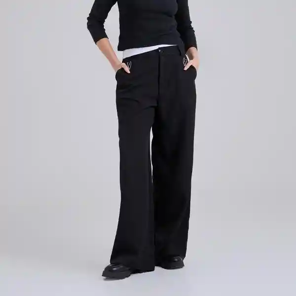 Pantalón bordado negro wide leg de tiro alto. 4 bolsillos, dos bolsillos diagonales en delantero y dos decorativos tipo ribete en posterior.3 pasadores en cintura y cierre frontal con cremallera y botón. Composición: 97 % Poliéster y 3% spandex. La modelo mide 1.70 mts y usa talla 38 Cuidados especiales: Leer la etiqueta de cuidados antes de lavar.
