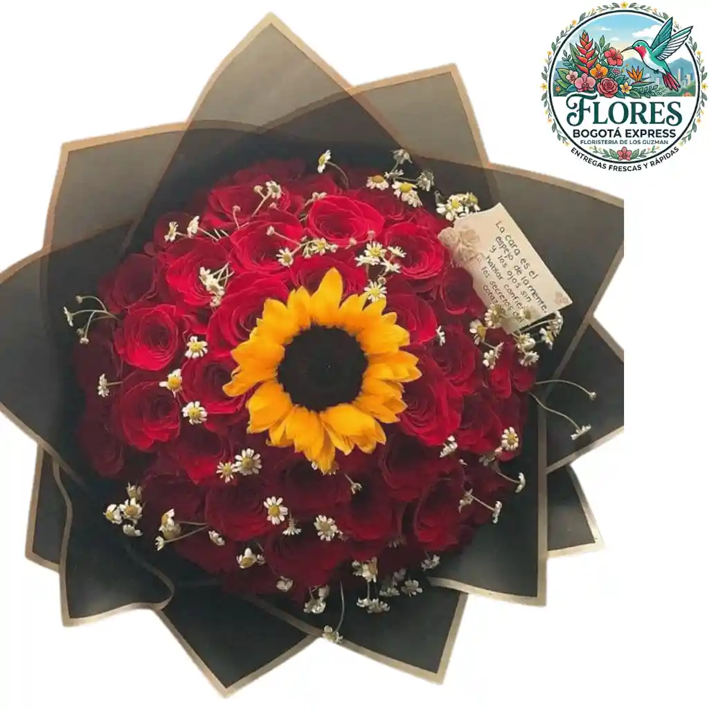 Espectacular bouquet compuesto por 48 rosas rojas que simbolizan un amor profundo e intenso, cuidadosamente dispuestas alrededor de un radiante girasol central que representa alegría y luz. Complementado con delicadas flores de manzanilla que aportan un toque silvestre y romántico, este arreglo destaca por su elegancia y armonía. Ideal para expresar sentimientos sinceros y hacer de cualquier ocasión un momento inolvidable.