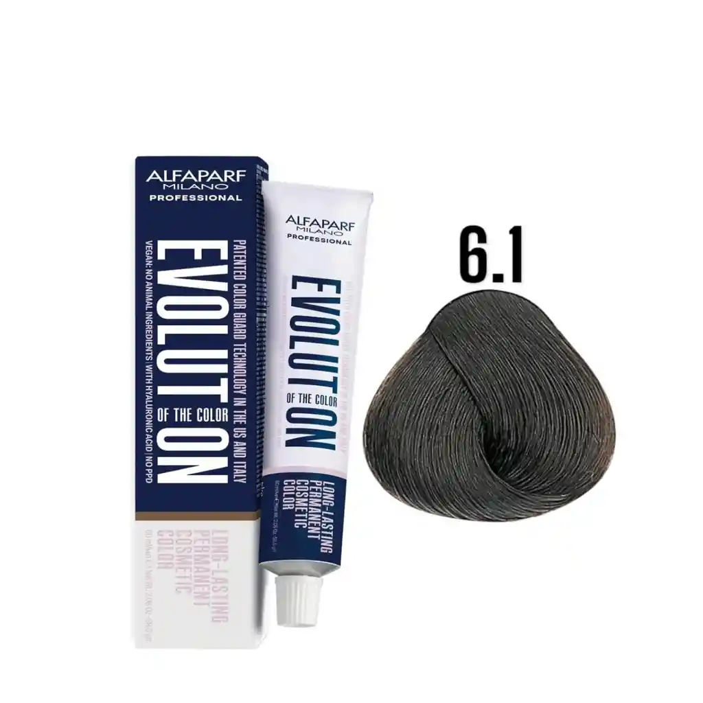 El 6.1 Rubio Oscuro Ceniza de la línea Evolution of the Color de Alfaparf Milano Professional es una coloración permanente en crema diseñada para ofrecer un tono frío y mate, ideal para quienes buscan neutralizar reflejos cálidos no deseados