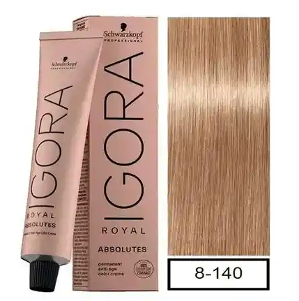 La coloración permanente en crema IGORA ROYAL Absolutes 8-140 Rubio Claro Ceniza Beige Natural cubre hasta el 100% de las canas. La crema puede usarse para todo tipo de técnicas de color. Proporciona un tono moda intenso, cubre las canas de manera superior en el cabello maduro y aclara hasta 3 tonos. IGORA ROYAL Absolutes, con Siliamina y Colágeno, contiene un polímero de cuidado de cadena larga que se adhiere a la superficie de la cutícula. La parte superior del polímero es suave y crea en el cabello una superficie lisa y uniforme que proporciona un tono y brillo óptimos.