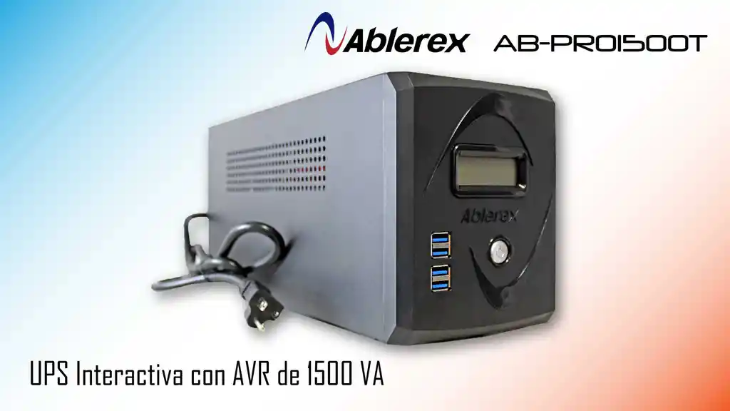 UPS interactiva con Regulador Automático de Voltaje (AVR), 1500 VA / 900 W, 120 V entrada / 120V salida, 50/60 Hz. Certificación RETIE vigente. Brinda protección contra sobretensiones (8 tomacorrientes) y con respaldo de energía (4 tomacorrientes). Incluye baterías internas para respaldo de energía. Botón de encendido/apagado y LCD con fondo azul. Clavija de entrada NEMA 5-15R, ocho (8) tomacorrientes NEMA 5-15R, RJ45 entrada/salida y 4 puertos USB 5 Vdc x 2.1 A. 3 años de garantía y 2 años en baterías