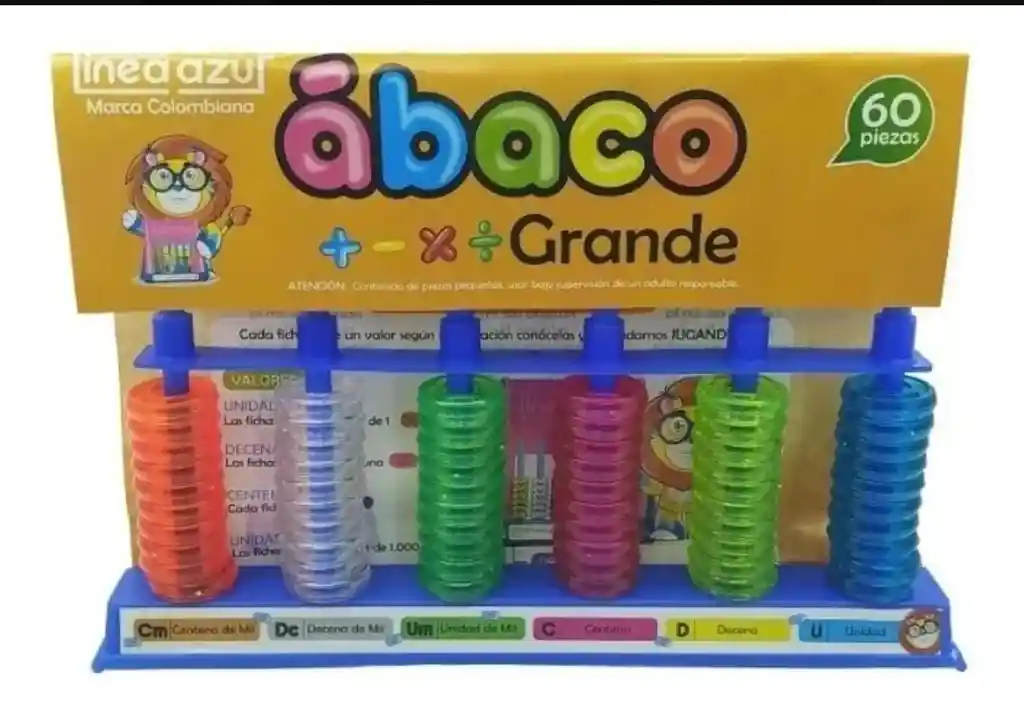 ABACO PLASTICO, para el aprendisaje de las operaciones basicas (suma, resta, multiplicacion y divicion) Incluye un marco con varillas y cuentas para representar números, y una tarjeta con ejemplos visuales de las operaciones.
