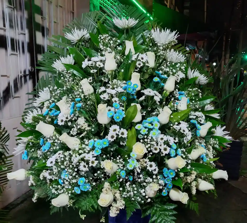 Arreglo con crisantemos, rosas, coquetas, yipso y follajes