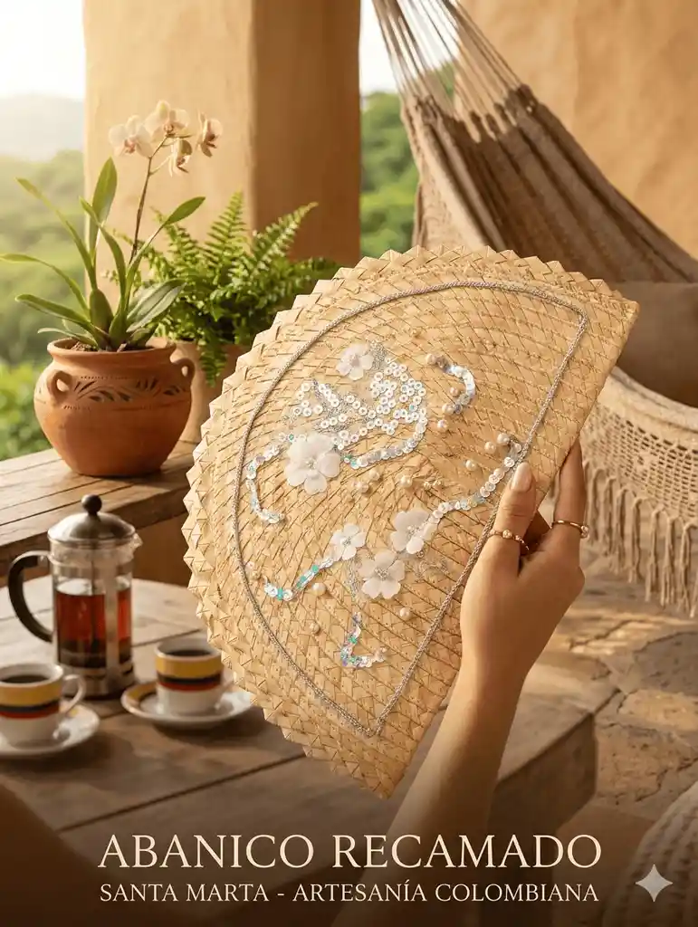 Abanico de palma natural recamado.