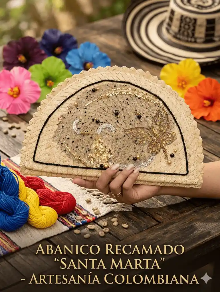 Abanico de palma natural recamado