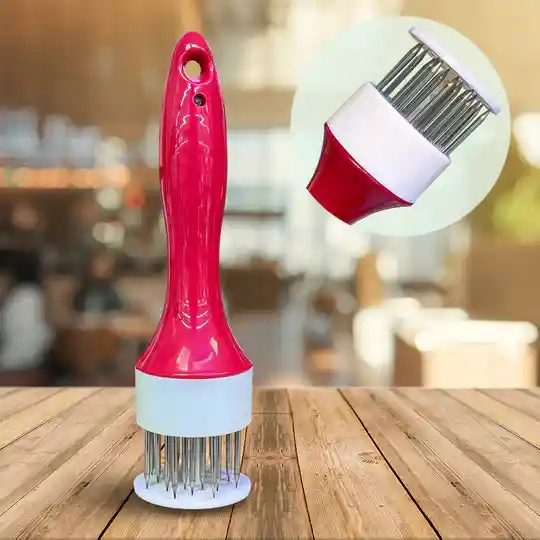 Es una herramienta de cocina utilizada para ablandar cortes de carne antes de cocinarlos. Cuenta con múltiples agujas o puntas que perforan la carne, rompiendo las fibras musculares y haciéndola más tierna. Este tipo de ablandador ayuda a que la carne absorba mejor los adobos y se cocine de manera más uniforme.