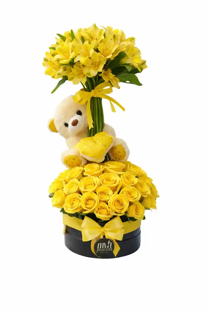 Abrazo Floral Este encantador arreglo floral combina la dulzura y la elegancia en un diseño único. En la parte superior, un adorable peluche sostiene con ternura un ramo vibrante de alstroemerias en tonos cálidos de rojo, naranja y amarillo. Estas flores simbolizan la amistad y la devoción, irradiando alegría y vitalidad. En la base del arreglo, un exuberante conjunto de rosas rojas expresa pasión y amor profundo, realzado con toques de hipérico rojo que aportan frescura y un contraste perfecto. Todo el arreglo está presentado en una elegante caja negra adornada con una cinta roja, añadiendo un toque de sofisticación. «Abrazo floral» es el regalo perfecto para sorprender y alegrar el día de alguien especial, combinando la ternura de un peluche con la elegancia de las flores, creando una experiencia inolvidable y llena de amor. Debido a la naturaleza única de nuestras flores, puede haber ligeras variaciones en los tonos, siempre manteniendo la armonía y la belleza que caracterizan a «Abrazo floral». Confía en nosotros para preservar la esencia y el encanto de este arreglo, asegurando que cada entrega sea tan especial y significativa como los sentimientos que deseas expresar.