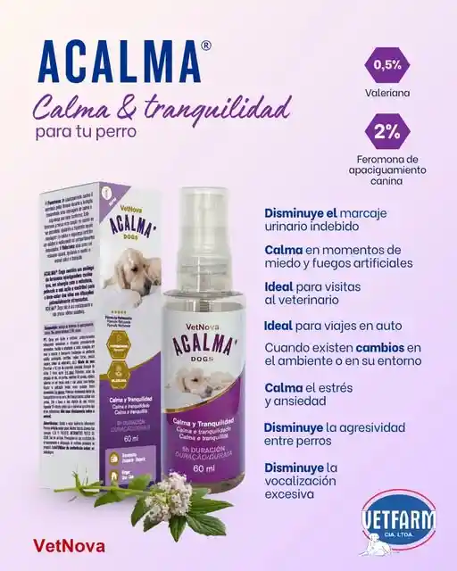 FACILITA LA ADAPTACIÓN A SITUACIONES POTENCIALMENTE ESTRESANTES, AYUDANDO A MANEJAR Y EVITAR COMPORTAMIENTOS INDESEADOS ASOCIADOS A ESTAS. Composición: Análogo de feromona de apaciguamiento canina ………….. 2% Extracto de valeriana ………………………………………………. 0,5% Características: ACALMA® Dogs contiene análogo de feromona de apaciguamiento canina que, en sinergia con el extracto de valeriana, potencia su acción y contribuye al bienestar del perro en situaciones potencialmente estresantes. Apto para todas las razas y edades. Uso puntual o prolongado. Olor característico a Valeriana. ACALMA® Dogs no es un medicamento y no produce efectos sedantes.