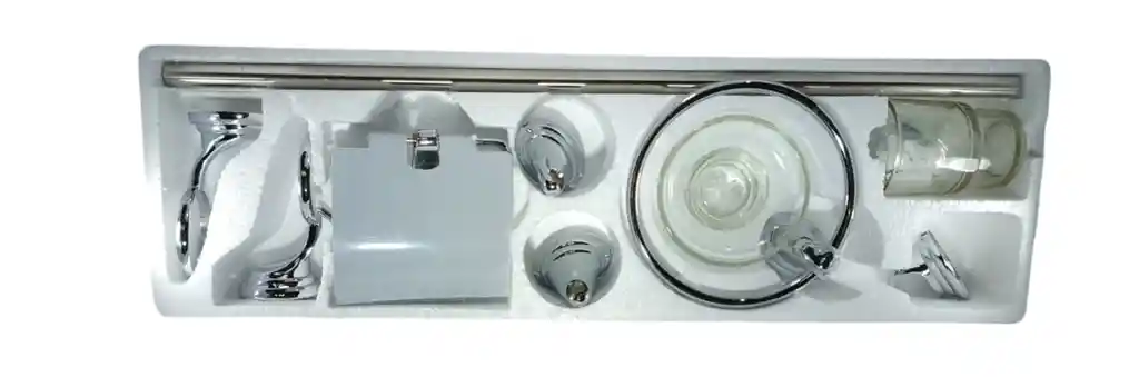 ACCESORIOS DE BAÑO •JUEGO DE 6 PIEZAS •MATERIAL EN ACERO INOXIDABLE Y CRISTAL •COLOR : CROMADO •MARCA: GRINETTO •INCLUYE CHAZOS PARA INSTALACION