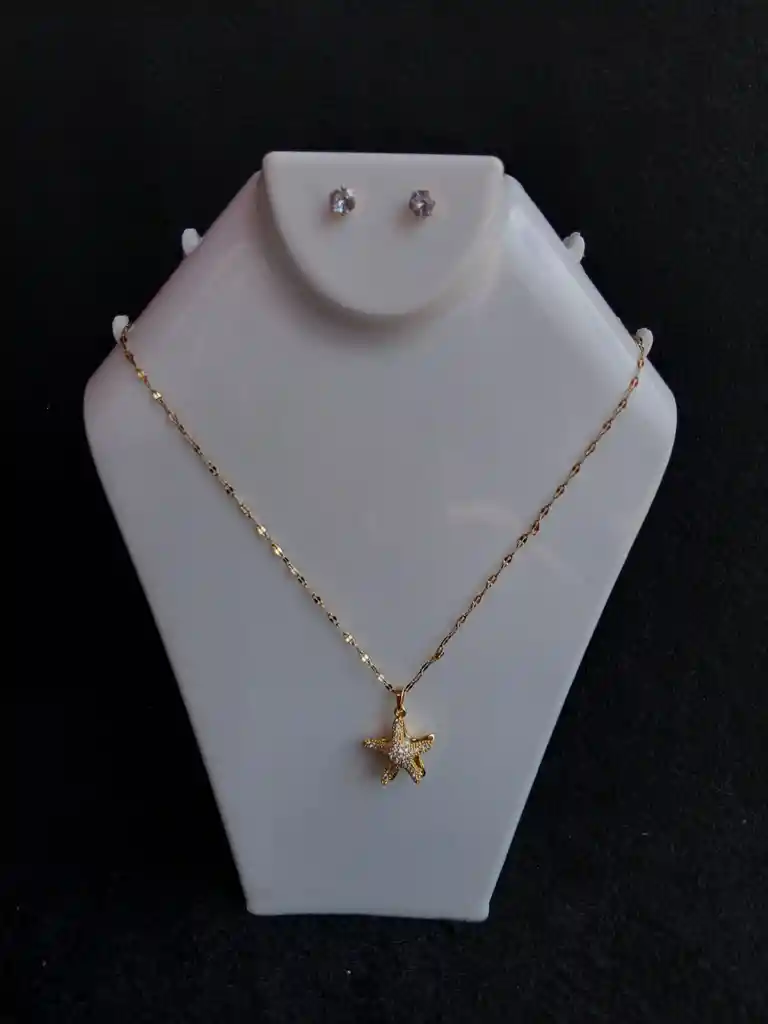 Juego de accesorios en acero inoxidable. Con pedrería en acrilico. Incluye: " para de aretes, cadena y dije.