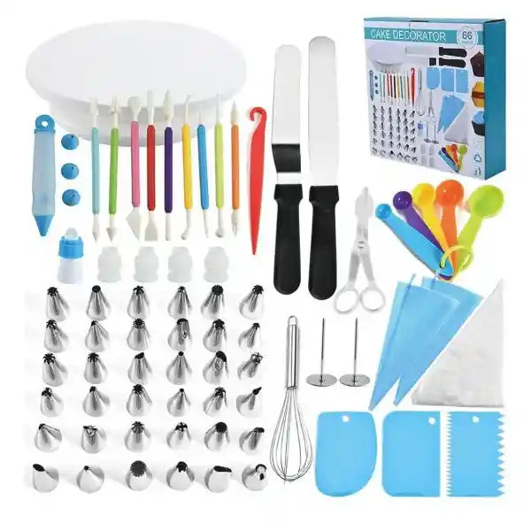 Viene por caja de 12 unidades Kit de herramientas para decoración de tartas, con plato giratorio para tartas, soporte giratorio para plato, bolsa de decoración, boca decorativa, batidor de huevos, raspadores de tartas, herramientas profesionales para hornear.