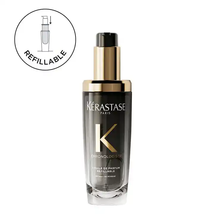 Con una infusión de extracto de mirra, L'Huile de Parfum Chronologiste de Kérastase es una fragancia de aceite capilar compuesta por una combinación excepcional de notas nobles del mundo de la perfumería fina: rosa de té, maderas claras y almizcle. Delicadamente perfumada, revitaliza, hidrata y espesa el cabello con solo unas gotas