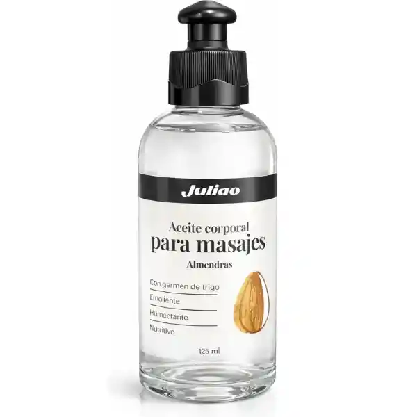 Aceite Corporal de Almendras – Marca Juliao Registro Sanitario INVIMA: NSOC19455-23CO El Aceite Corporal de Almendras Juliao es un aliado ideal para el cuidado diario de la piel, especialmente para quienes buscan suavidad, nutrición profunda y un toque de bienestar en su rutina. Formulado con aceite puro de almendras y enriquecido con germen de trigo, ofrece un equilibrio perfecto entre hidratación prolongada y una sensación ligera que se absorbe con facilidad. El aceite de almendras es reconocido por sus propiedades emolientes, capaces de suavizar y mejorar la elasticidad de la piel. Su textura delicada permite que se deslice fácilmente durante masajes corporales, proporcionando una experiencia sensorial cálida, relajante y agradable. A esto se suma el germen de trigo, un ingrediente rico en vitaminas y antioxidantes que contribuyen a nutrir la piel en profundidad y a protegerla del envejecimiento prematuro. Esta combinación de activos convierte al aceite en un producto completo para quienes desean mantener su piel tersa, luminosa y bien cuidada. Su aroma suave y natural brinda una sensación refrescante que acompaña durante el día, sin resultar invasiva. Gracias a sus componentes hidratantes, este aceite ayuda a fortalecer la barrera cutánea, disminuyendo la resequedad y aportando una textura más uniforme. También es ideal para pieles que requieren un extra de nutrición, como las que se exponen al sol, al frío o a condiciones ambientales que tienden a deshidratarla. Beneficios principales Hidrata profundamente y suaviza la piel desde la primera aplicación. Contribuye a prevenir la resequedad, aspereza y descamación. Favorece la elasticidad cutánea, siendo útil para zonas como brazos, piernas y abdomen. Aporta nutrientes esenciales gracias al contenido de germen de trigo, rico en vitamina E. Ayuda a retardar signos visibles del envejecimiento, como líneas de expresión y pérdida de firmeza. Ideal para masajes corporales por su textura deslizante y cómoda. Brinda una sensación fresca con un aroma agradable y ligero. Modo de uso Aplicar una cantidad moderada sobre la piel limpia y seca. Distribuir con movimientos suaves y circulares hasta lograr una absorción uniforme. Para masajes corporales, colocar un poco más de producto en la zona a trabajar y esparcir lentamente para lograr un mejor deslizamiento. Puede emplearse diariamente, preferiblemente después del baño, para aprovechar la humedad natural de la piel y potenciar la hidratación.