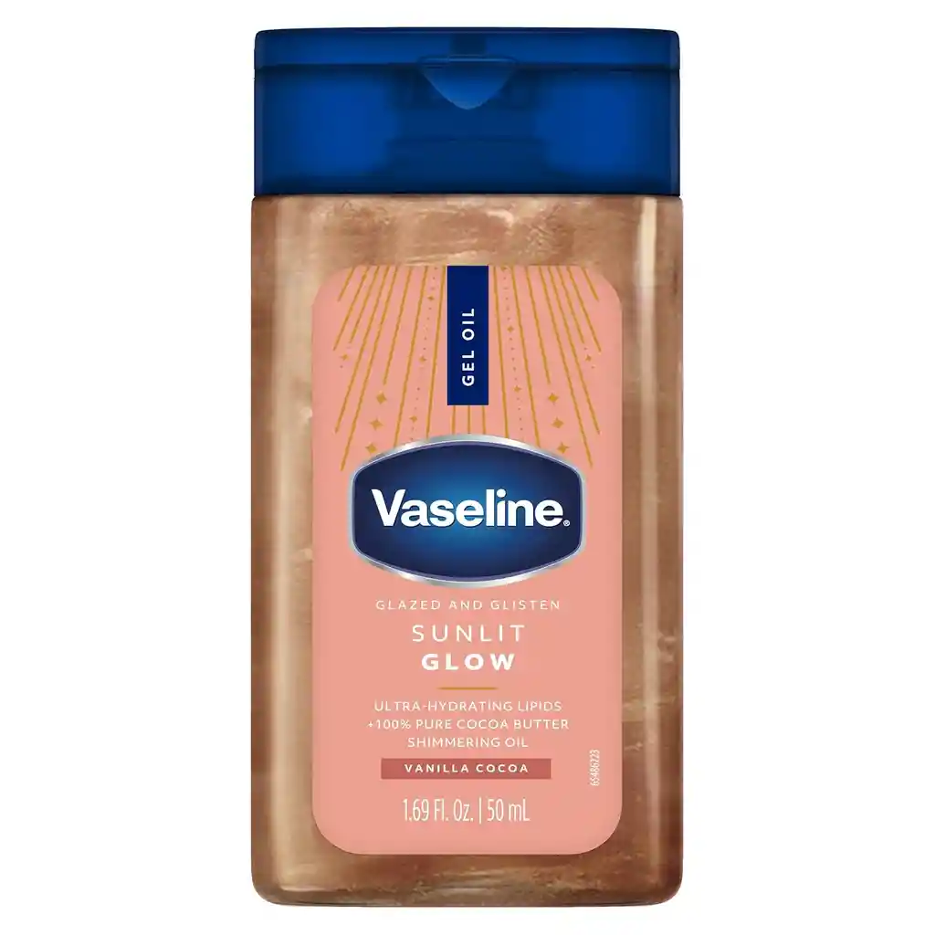 Nuevo Vaseline Glazed & Glisten Shimmering Body Gel Oil, una lujosa y sedosa fórmula en gel de aceite que se funde en la piel, dejando un brillo champán melocotón que atrapa la luz para una luminosidad suave e iluminada por el sol, sin teñir la piel. Transporta tus sentidos con una adictiva mezcla de fragancias de cálida vainilla y manteca de cacao tostada, que envuelve la piel en un brillo y un aroma que perdura como la suave luz del día y el sol en la piel. Este aceite corporal ligero y brillante se desliza con un glaseado transparente de melocotón y un acabado húmedo y brillante que se absorbe rápidamente, sin residuos pegajosos.