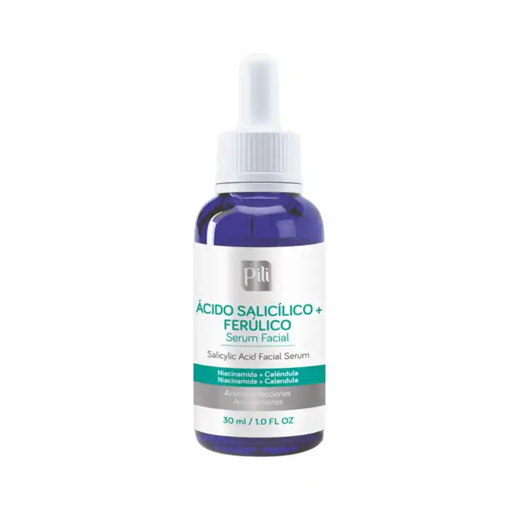Matifica y Protege tu Piel con Ácido Salicílico y Ferúlico Si tienes piel grasa, con barritos, espinillas o puntos negros, sabes lo frustrante que puede ser luchar contra el exceso de brillo y las imperfecciones que parecen no desaparecer. Estas afecciones no solo afectan tu apariencia, sino que también pueden disminuir tu confianza. El sebo excesivo, los poros obstruidos, y los brotes constantes son señales de una piel que necesita cuidados específicos y efectivos. Nuestro serum de ácido salicílico y ferúlico es la solución definitiva para tratar estos problemas. Formulado especialmente para pieles con imperfecciones, este serum actúa sobre las causas subyacentes de la piel grasa y propensa a brotes. El ácido salicílico, un potente agente exfoliante, penetra profundamente en los poros, desobstruyéndolos y eliminando las células muertas que se acumulan en la superficie de la piel. Esto reduce la aparición de barritos y espinillas, previniendo futuros brotes y dejando la piel más limpia y despejada. Además, el ácido ferúlico actúa como un potente antioxidante que combate los radicales libres, responsables del daño celular y del envejecimiento prematuro. Este ingrediente no solo protege la piel de los factores ambientales dañinos, sino que también potencia la acción de otros activos presentes en el serum, como el ácido salicílico, haciéndolo aún más efectivo. El resultado es una piel no solo libre de imperfecciones, sino también matificada, con un acabado suave y sin brillo, algo que quienes tienen piel mixta o grasa apreciarán especialmente. Ingredientes: Ácido Salicílico: Exfolia suavemente la piel al eliminar células muertas y desobstruir los poros, lo que ayuda a reducir barritos y espinillas. Ácido Ferúlico: Actúa como un potente antioxidante que protege la piel de los daños causados por radicales libres y la exposición ambiental. Niacinamida: Reduce manchas oscuras y mejorar la uniformidad del tono de la piel, protege contra irritaciones. Completa tu rutina con nuestros productos para piel con barritos y espinillas