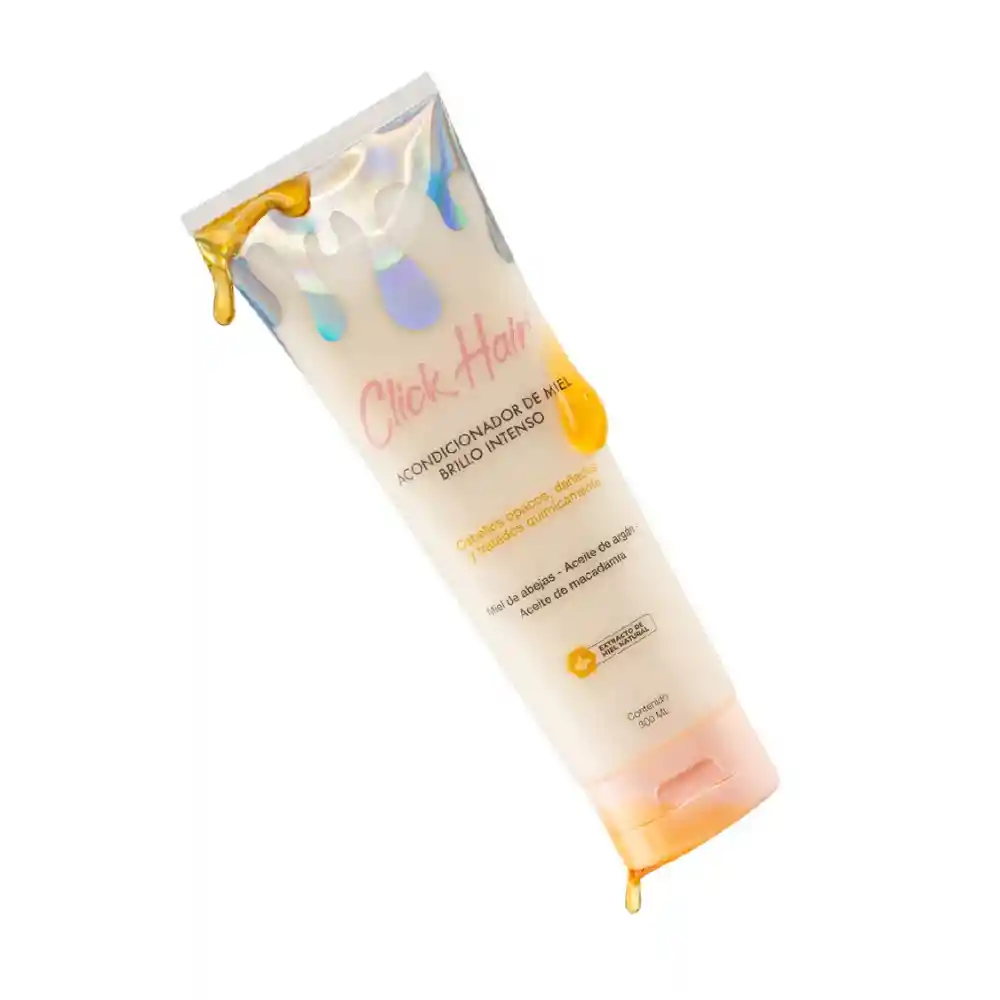 Nutre tu cabello profundamente con nuestra composición especializada con miel natural, creada para ofrecer hidratación intensa, suavizar cada hebra y devolver el brillo natural desde el primer uso. Esta mezcla está enriquecida con miel de abejas, aceite de coco y pantenol, activos reconocidos por su poder reparador y humectante. Este acondicionador cremoso de textura ligera hidrata las puntas, reduce el frizz y facilita el desenredado sin dejar el cabello pesado. La miel actúa como un humectante natural, sellando la hidratación y dejando tu cabello más suave, brillante y protegido contra los daños externos. Ideal para todo tipo de cabello. Incorporar el acondicionador en tu rutina de lavado es un paso indispensable, un verdadero must para mantener un cabello fuerte, hidratado y saludable. Complementa tu rutina con toda la línea de miel Click Hair para potenciar al máximo los resultados y disfrutar de un cabello visiblemente más nutritivo, brillante y lleno de vida. Contenido 300ml