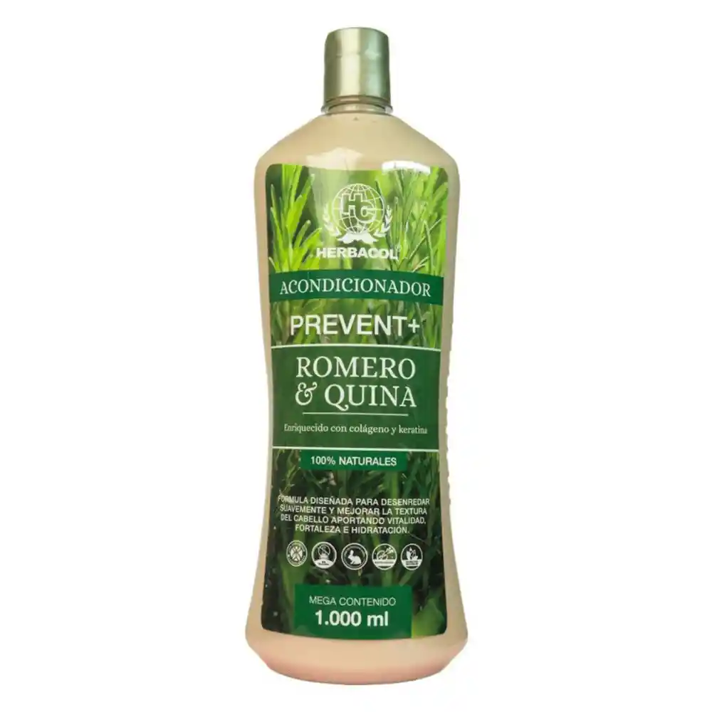 Herbacol Acondicionador Prevent+ Romero y Quina 1000ml Nuestro acondicionador, elaborado con ingredientes naturales, crea una poderosa combinación de aceite de Romero, Aceite de Quina, Aceite Vegetal, Keratina y Colágeno. Esta fórmula proporciona suavidad y fortaleza al cabello, mejorando su textura y dejándolo manejable. Esto permite desenredarlo fácilmente, previniendo la debilidad, resequedad y ruptura del cabello, aportando un aspecto saludable, brillante y radiante. Beneficios Suaviza y fortalece el cabello con Romero, Quina, Keratina y Colágeno. Mejora la textura y facilita el desenredado, reduciendo el quiebre. Previene la resequedad y la debilidad capilar desde la primera aplicación. Deja el cabello manejable, brillante y con un aspecto visiblemente saludable. Ideal para complementar tu rutina capilar y potenciar los resultados de la línea Prevent+. Modo de uso Después de lavar el cabello con el Shampoo de ROMERO & QUINA de la línea PREVENT+, proceda a aplicar el Acondicionador de ROMERO & QUINA de la línea PREVENT+ llevándolo de medios a puntas con suaves masajes. Déjelo actuar mínimo 1 minuto y enjuaga. Recomendamos utilizar el Acondicionador siempre después de cada lavada. ¡Recuerda! si utilizas toda la línea PREVENT+, obtendrás excelentes resultados.