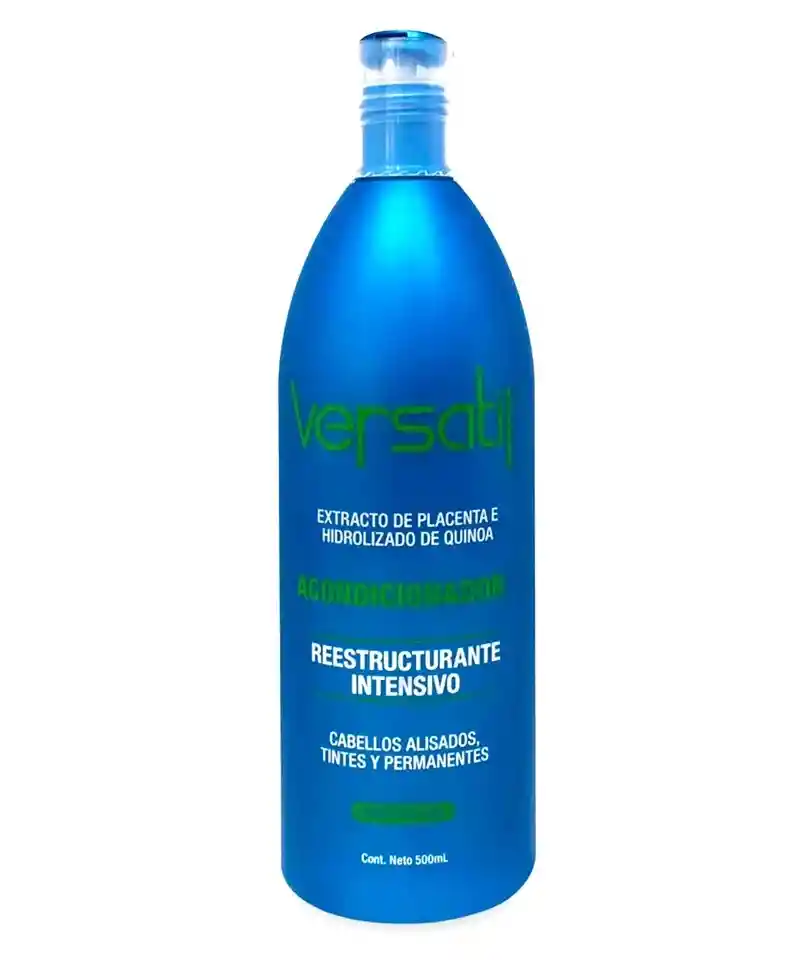 El Acondicionador Versatil es un reestructurante intensivo diseñado especialmente para cabellos alisados, con tintes o permanentes. Su fórmula avanzada contiene extracto de placenta e hidrolizado de quinoa, componentes que trabajan en conjunto para revitalizar y fortalecer la fibra capilar dañada por procesos químicos. Es un producto libre de sal, lo que garantiza un cuidado suave que prolonga la duración de los tratamientos y mantiene el cabello saludable, manejable y con brillo.