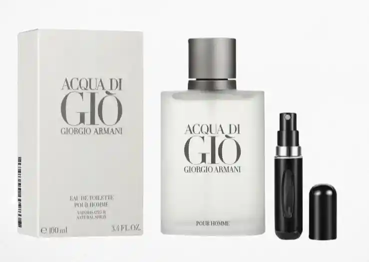 Acqua Di Gio 1.1 es una fragancia masculina tipo Eau de Toilette, con perfil aromático acuático y fondo cítrico. Su composición combina notas de bergamota, neroli, jazmín, romero, pachulí y almizcle blanco. Diseñada para proyectar frescura mediterránea, masculinidad serena y elegancia atemporal. Presentación en frasco de 100 ml versión 1.1, acompañado de perfumero recargable (color sujeto a disponibilidad). Producto empacado en caja con celofán, pin y sello.