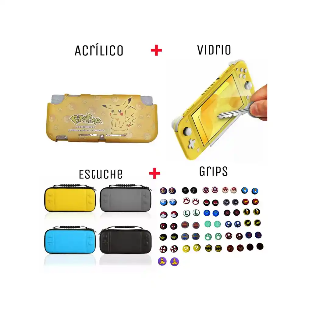 Acrilico Protector De Pikachu + Estuche + Vidrio + 2 Grips Compatible Con Switch LITE