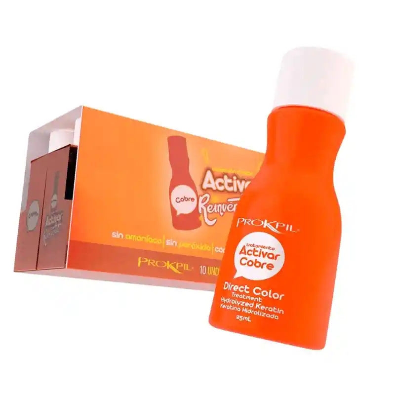 ACTIVAR PROKPIL MATIZANTE COBRE 25 ML : Desarrollado para renovar el color del cabello tinturado o con mechas, el Tratamiento Activar re-pigmenta mientras repara la fibra capilar gracias a que está enriquecido con keratina y no contiene amoniaco ni peróxido de hidrógeno. Son pigmentos concentrados para coloración directa y de acción semipermanente sin peróxido ni reveladores. 1. TONOS FANTASÍA. Son colores radiantes y se necesitan solo bases claras para disfrutar del color Fucsia, Rojo, Azul, Malva, Verde, Amarillo y Cobre. 2. INTENSIFICADOR DE COLOR. Se utilizan directo o en mezcla para brindar mayor intensidad del color y durabilidad al reflejo de la tintura, Negro, Rojo, Azul, Malva, Tabaco, Chocolate. 3. PERSONALIZA EL COLOR. Para mezclar entre sí y crear gamas infinitas de color, ideal para coloristas. 4. PARA NEUTRALIZAR TONOS AMARILLENTOS. En procesos de alisados progresivos (Queratinas) el color malva se mezcla por gotas de acuerdo a la cantidad por cada 10 g de Queratina 1 gota de Activar Malva. 5. PARA DAR COLOR. Después de alisado químico permanente o alisados alcalinos. Después de la decoloración. 6. TONOS PASTEL. Son aquellos que dan la sensación de ser suaves y cremosos y para crearlos siempre utilizamos cremas blancas como base de dilución.