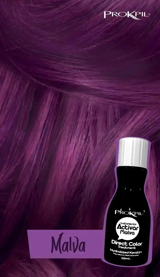 ACTIVAR PROKPIL MATIZANTE MALVA 25 ML : Desarrollado para renovar el color del cabello tinturado o con mechas, el Tratamiento Activar re-pigmenta mientras repara la fibra capilar gracias a que está enriquecido con keratina y no contiene amoniaco ni peróxido de hidrógeno. Son pigmentos concentrados para coloración directa y de acción semipermanente sin peróxido ni reveladores. 1. TONOS FANTASÍA. Son colores radiantes y se necesitan solo bases claras para disfrutar del color Fucsia, Rojo, Azul, Malva, Verde, Amarillo y Cobre. 2. INTENSIFICADOR DE COLOR. Se utilizan directo o en mezcla para brindar mayor intensidad del color y durabilidad al reflejo de la tintura, Negro, Rojo, Azul, Malva, Tabaco, Chocolate. 3. PERSONALIZA EL COLOR. Para mezclar entre sí y crear gamas infinitas de color, ideal para coloristas. 4. PARA NEUTRALIZAR TONOS AMARILLENTOS. En procesos de alisados progresivos (Queratinas) el color malva se mezcla por gotas de acuerdo a la cantidad por cada 10 g de Queratina 1 gota de Activar Malva. 5. PARA DAR COLOR. Después de alisado químico permanente o alisados alcalinos. Después de la decoloración. 6. TONOS PASTEL. Son aquellos que dan la sensación de ser suaves y cremosos y para crearlos siempre utilizamos cremas blancas como base de dilución.
