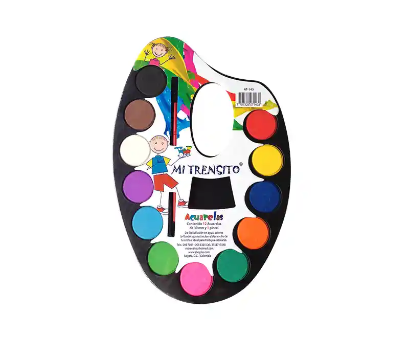 Acuarela x 12 colores, mas 1 pincel. De fácil dilución en agua, colores que estimulan el desarrollo de los niños. Ideal para trabajos escolares. Medidas: 24 x 16 cm Aprox Marca mi Trensito