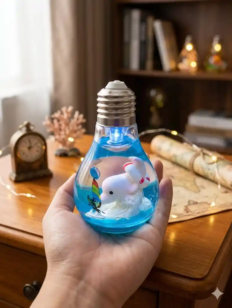 Acuario luminoso en forma de bombillo. Hermoso recuerdo del mar y Santa Marta