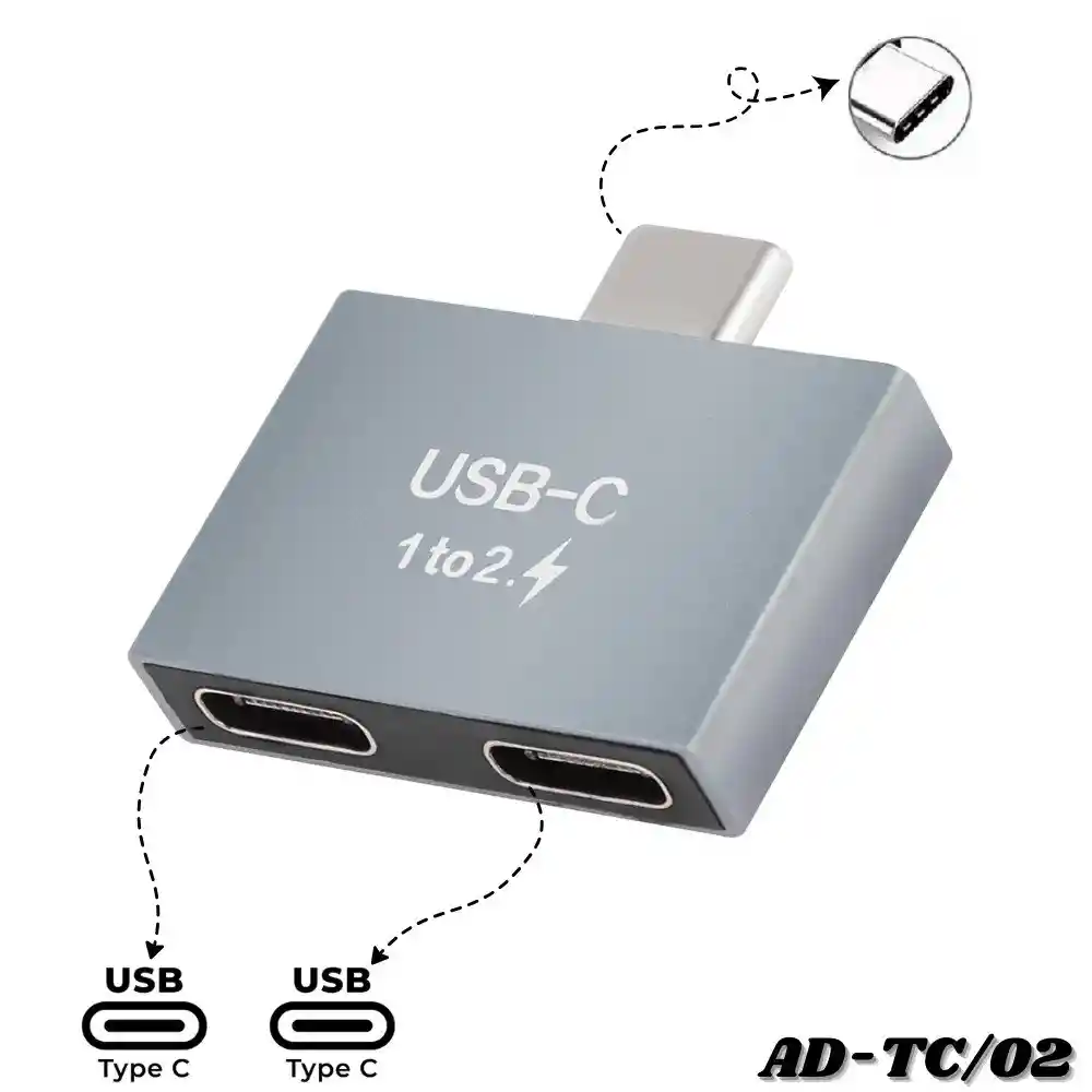 Adaptador Convertidor Duplicador Tipo C AD-TC/02 Maximiza la funcionalidad de tus dispositivos sin límites. El adaptador duplicador Tipo C AD-TC/02 es la solución definitiva para los smartphones, tablets y laptops de nueva generación que cuentan con un único puerto. Con este accesorio compacto, ya no tendrás que elegir entre cargar la batería de tu equipo o usar tus audífonos/transferir datos; podrás hacer ambas cosas al mismo tiempo y sin perder calidad. Características: - Doble Funcionalidad: Expande un solo puerto USB-C y lo convierte en dos. Ideal para conectar tus audífonos Tipo C y el cable de carga de manera simultánea. - Soporte para Carga: No sacrifiques rendimiento. Su diseño incluye soporte de energía óptimo, asegurando que tu dispositivo reciba la carga necesaria de forma segura. - Tecnología Plug & Play: No requiere instalación de aplicaciones, controladores ni configuración previa. Simplemente conéctalo y estará listo para usarse. Especificaciones: - Modelo: AD-TC/02. - Conector de entrada: 1x USB Tipo C (Macho). - Conectores de salida: 2x USB Tipo C (Hembra). - Materiales: Carcasa de aleación de aluminio. - Compatibilidad: Ampliamente compatible con la mayoría de dispositivos con puerto Tipo C (Smartphones Android, iPads con puerto C, laptops y más).
