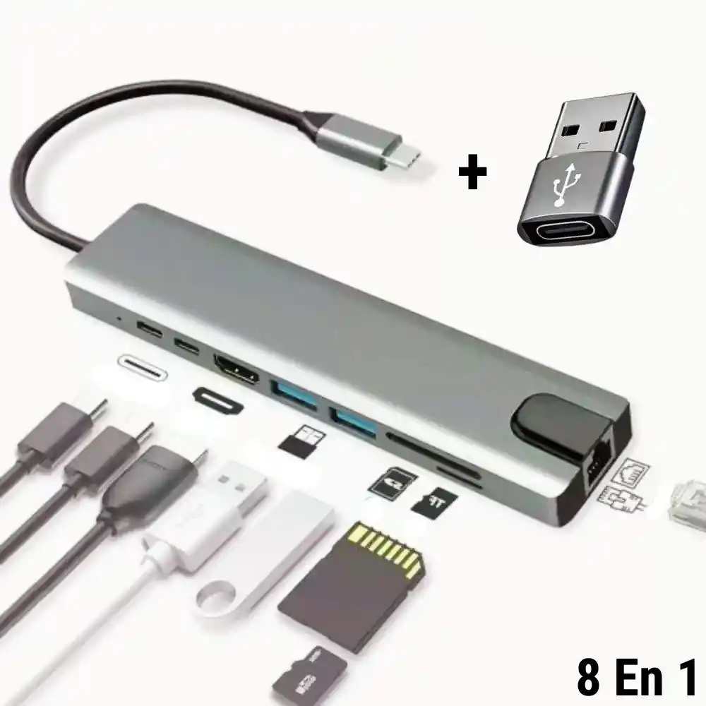 Adaptador Convertidor Usb C 8 En 1 Multipuerto Hub Usb C Hdmi 4k Con Adaptador Otg Con este Hub Multipuerto 8 en 1, convierte un solo puerto USB-C de tu computador en una estación de trabajo completa. Conecta pantallas, internet por cable, memorias y más, todo al mismo tiempo. Además, incluye un adaptador OTG (USB a Tipo C) para que puedas usar tus dispositivos USB tradicionales en puertos modernos. Características: - Conexión a Internet Estable (RJ45): Olvídate de la inestabilidad del Wi-Fi. Este Hub incluye puerto Ethernet para navegar a máxima velocidad y seguridad por cable de red. - Salida de Video HDMI 4K: Transmite imagen de alta definición a tu televisor, monitor o proyector. - Transferencia de Datos Veloz: Cuenta con puertos USB estándar (compatibles con 3.0) para mover archivos en segundos desde tu memoria USB o disco duro. - Lector de Tarjetas SD y Micro SD: Descarga las fotos de tu cámara o celular rápidamente gracias a sus ranuras dedicadas para tarjetas de memoria. Especificaciones: 1x HDMI,Resolución hasta 4K UHD 1x RJ45 (Ethernet),Conexión a red LAN cableada 1x USB-C (PD),Carga rápida. 1x USB-C (Datos),Transferencia de datos rápida 2x USB 3.0 / 2.0,"Para periféricos (Mouse, Teclado, USB)" 1x Ranura SD,Tarjetas de cámara grandes 1x Ranura TF/MicroSD,Tarjetas de celular pequeñas Paquete Incluye: 1x Hub Multipuerto USB-C 8 en 1. 1x Adaptador OTG (USB A a USB C).