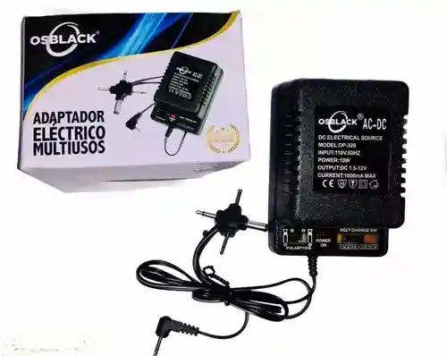 Adaptador fuente de energía continua multiusos DP-328 OSBLACK CARACTERÍSTICAS: • 4 Plugs universales y plug mini • Indicador LED • Voltaje de entrada: 110V / 50Hz • Power: 10W • Voltaje de salida: 1.5V/ 3V/ 4.5V/ 6V/ 7.5V/ 9V/ 12V • Corriente: 1000mA MAX • 5 Conectores macho tipo plug DC incluyendo 5.5 mm x 2.5 mm y 2.5 mm x 0.75 mm • Polaridad del plug configurable con suiche