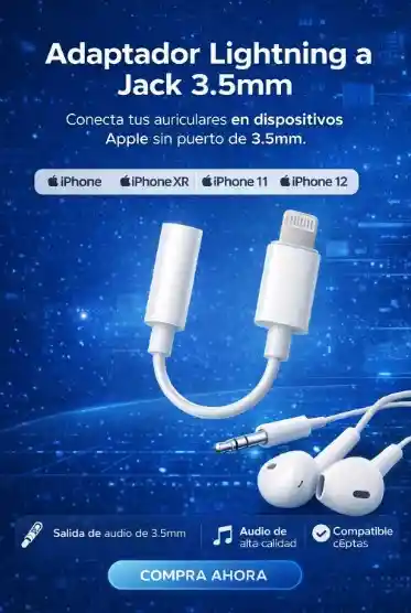 El Adaptador Lightning a Jack 3.5mm es la solución perfecta para aquellos que desean conectar sus auriculares de 3.5mm a dispositivos Apple que no cuentan con un puerto tradicional para audífonos. Este adaptador, de alta calidad, permite disfrutar de audio nítido y sin interrupciones, ofreciendo una experiencia de escucha superior. Compatible con una amplia gama de dispositivos Apple, como iPhone 7 y modelos posteriores, iPad, iPod Touch y otros dispositivos con conector Lightning. Su diseño compacto y fácil de usar hace que sea una opción ideal para llevar a todas partes sin complicaciones. Disfruta de tus canciones, podcasts y llamadas con la mejor calidad de sonido y sin preocupaciones. Beneficios: Conexión rápida y estable. Sonido de alta calidad sin distorsiones. Fácil de transportar gracias a su tamaño compacto. Compatible con la mayoría de auriculares de 3.5mm. Características: Conector Lightning para dispositivos Apple. Salida de audio de 3.5mm compatible con la mayoría de auriculares. Conexión sin necesidad de software adicional. Plug and play: solo conecta y empieza a disfrutar. Usos: Conecta auriculares, altavoces, audífonos o cualquier dispositivo de audio de 3.5mm a tu iPhone o iPad. Ideal para quienes extrañan el conector de auriculares tradicional después de que Apple eliminó el puerto de 3.5mm