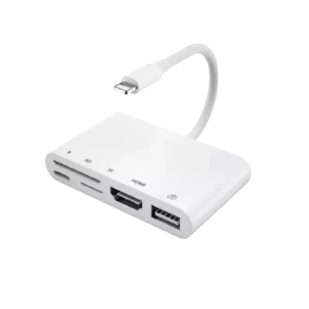 ¡Libérate de las limitaciones con nuestro Adaptador Lightning a HDMI + Audífonos USB + Carga Lightning + Micro SD y SD! Características Destacadas: Multifuncional y Compatible: Diseñado para brindarte máxima versatilidad, este adaptador es compatible con una amplia gama de dispositivos Apple, desde los últimos modelos hasta los clásicos. Sea cual sea tu dispositivo, disfruta de todas las funcionalidades sin inconvenientes. Conectividad Total: Con este adaptador, podrás conectar tu iPhone o iPad a una pantalla HDMI para disfrutar de tus contenidos favoritos con calidad visual impresionante. Además, cuenta con audífonos USB para una experiencia de audio inmersiva. Carga Rápida: Olvídate de quedarte sin batería. Este adaptador no solo amplía tus opciones de conectividad, sino que también te permite cargar tu dispositivo de manera eficiente mientras disfrutas de tus actividades multimedia. Ampliación de Almacenamiento: Equipado con ranuras para tarjetas Micro SD y SD, así como un puerto USB, este adaptador te permite ampliar el almacenamiento de tu dispositivo de manera sencilla y práctica. Diseño Compacto y Portátil: Llévalo contigo a donde vayas. Su diseño compacto y portátil te permite disfrutar de todas estas funciones sin sacrificar la comodidad ni la elegancia. Con nuestro Adaptador Lightning a HDMI + Audífonos USB + Carga Lightning + Micro SD y SD, experimenta la conectividad total y aprovecha al máximo tus dispositivos Apple. ¡Obtén el tuyo ahora y abre todo un mundo de posibilidades!