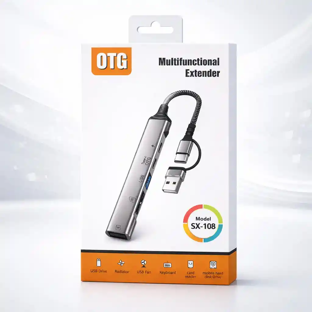 Convierte tu puerto Tipo C en múltiples conexiones con este Adaptador OTG Multifuncional SX-108. Ideal para celulares compatibles con OTG, tablets y portátiles con puerto Tipo C. Permite conectar memorias USB, teclado, mouse, lector de tarjetas y otros dispositivos al mismo tiempo. Perfecto para trabajo, estudio, presentaciones o uso diario. Funciones principales: Puerto USB para memorias y periféricos Puerto HDMI para conexión a pantalla externa Entrada Tipo C para carga Compatible con dispositivos OTG Diseño compacto y resistente Modelo: SX-108 Amplía la capacidad de tu equipo sin necesidad de instalar programas. Ideal para quienes necesitan productividad móvil.