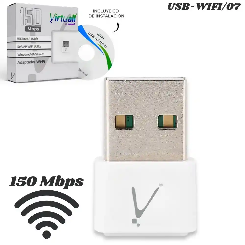 Adaptador Receptor Wifi Usb Inalambrico 150 Mbps El Mini Adaptador USB WiFi, Es la forma más rápida, discreta y sencilla de dotar a cualquier equipo de conectividad inalámbrica estable y de excelente alcance. Características: - Velocidad Confiable de 150 Mbps: Trabaja bajo el estándar inalámbrico IEEE 802.11b/g/n en la banda de 2.4 GHz, ofreciendo velocidades de hasta 150 Megabits por segundo. Es la capacidad perfecta y fluida para tus tareas diarias sin interrupciones. - Función Soft AP: ¡Esta es una función estrella! No solo recibe señales inalámbricas, sino que también puede transmitir señales para portátiles, teléfonos inteligentes, tabletas, etc. - Compatibilidad Universal: Es plenamente compatible con Windows, Mac y Linux. Especificaciones: - Velocidad Máxima de Transmisión: 150 Mbps. - Frecuencia de Operación: 2.4 GHz. - Estándares Inalámbricos: IEEE 802.11n, IEEE 802.11g, IEEE 802.11b. - Interfaz de Conexión: USB 2.0. - Sistemas Operativos Soportados: Windows (XP/7/8/10/11), macOS, Linux. - Seguridad Soportada: Encriptación WEP, WPA, WPA2. Nota: Las imágenes publicadas son de referencia, el producto real puede presentar ligeras variaciones en su diseño y tonalidad de color