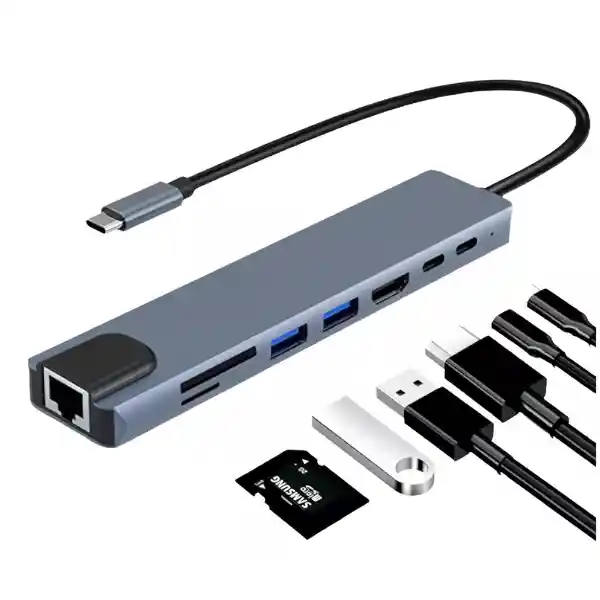 HUB USB TIPO C 8 EN 1 DOCKING STATION -HDTV -4K*2K(3840*2160), Compatible con 1080P, 720P, etc. -USB*2 – Alta Velocidad USB, Power Supply Sobre 4,5W Max. -USB C Hembra Port 1- PD,20V@3A, Soporta Max 87W -USB C Hembra Port 2- Alta velocidad USB-C, Soporta Hasta 4.5W -USB C Macho, Compatible con Thunderboil 3, -RJ45- Maxima Velocidad 100Mbps/1000Mbps -SD/TF Card Reader- SD y TF pueden trabajar simultáneamente, Lee y escribe a alta velocidad. -Compatible con MacBook 2018/2017/2016/MacBook Pro 2018/2017, Ipad -Pro2018, Nintendo Switch, Chromebook, -Huawei mate20/mate20 pro/ Samsung S8/S9/sup, Note 8/Note 9/HP Spectre Pavilon, Huawei Matebook, Dell XPS -Soporta Smartphone y Tablets con Función DP'.